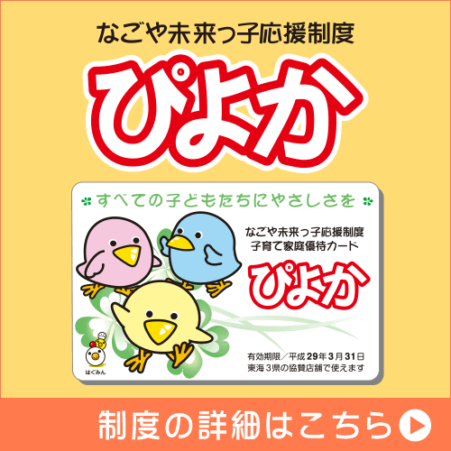 協賛店の方は、愛知県の「はぐみんカード」、岐阜県の「ぎふっこカード」、「三重県子育て家庭応援クーポン」を提示された方へも、「ぴよか」と同様の特典サービスの提供をお願いします。