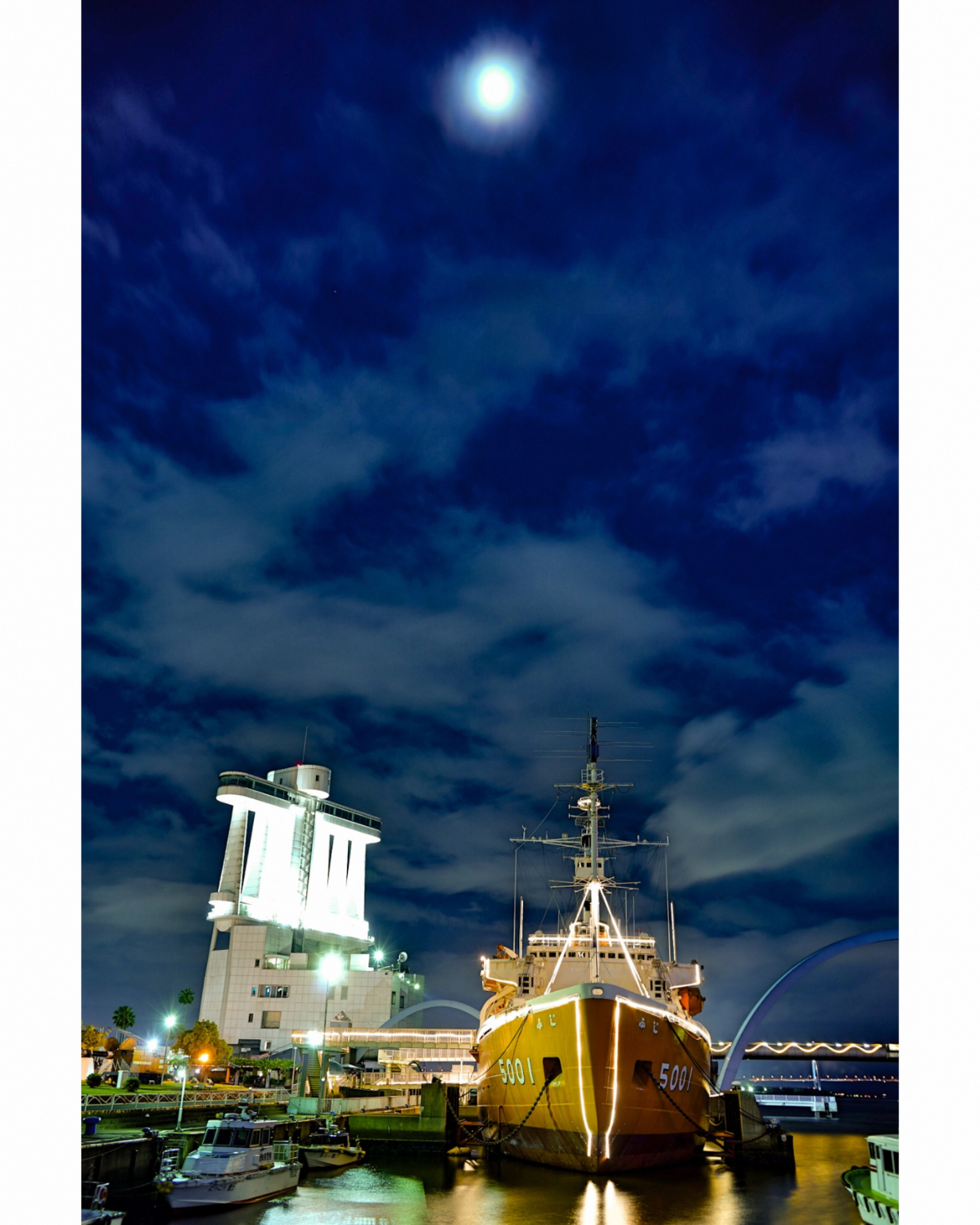 「夜の南極観測船ふじと名古屋港ポートビル」の写真データ
