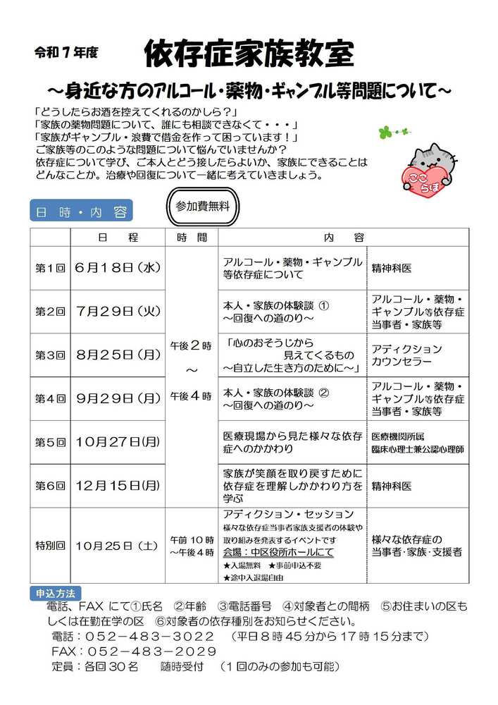 電話・ファクスにて「1.氏名 2.年齢 3.電話番号 4.対象者との間柄 5.お住まいもしくは在勤在学の区 6.対象者の依存種別」を名古屋市精神保健福祉センターまでお知らせください。