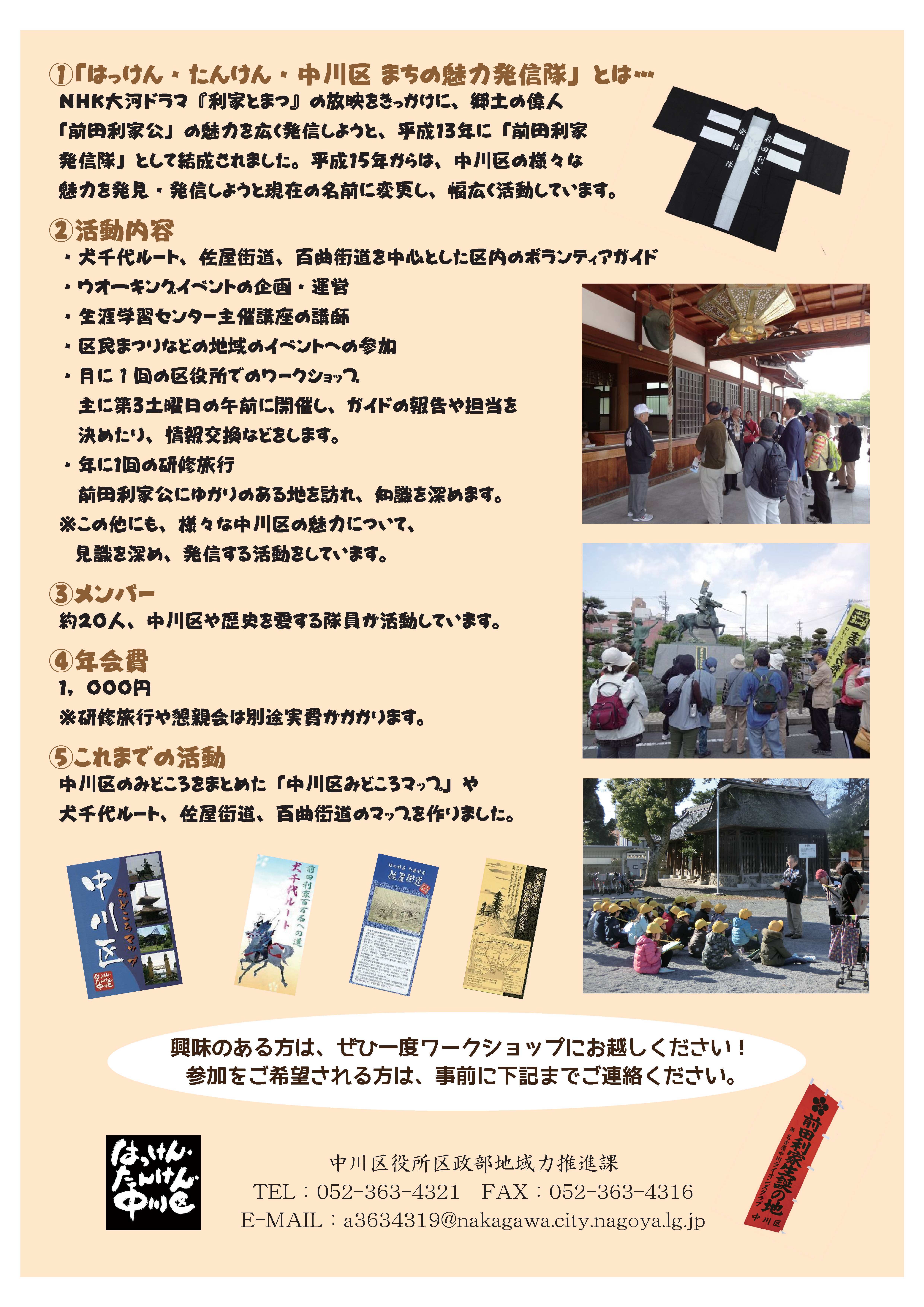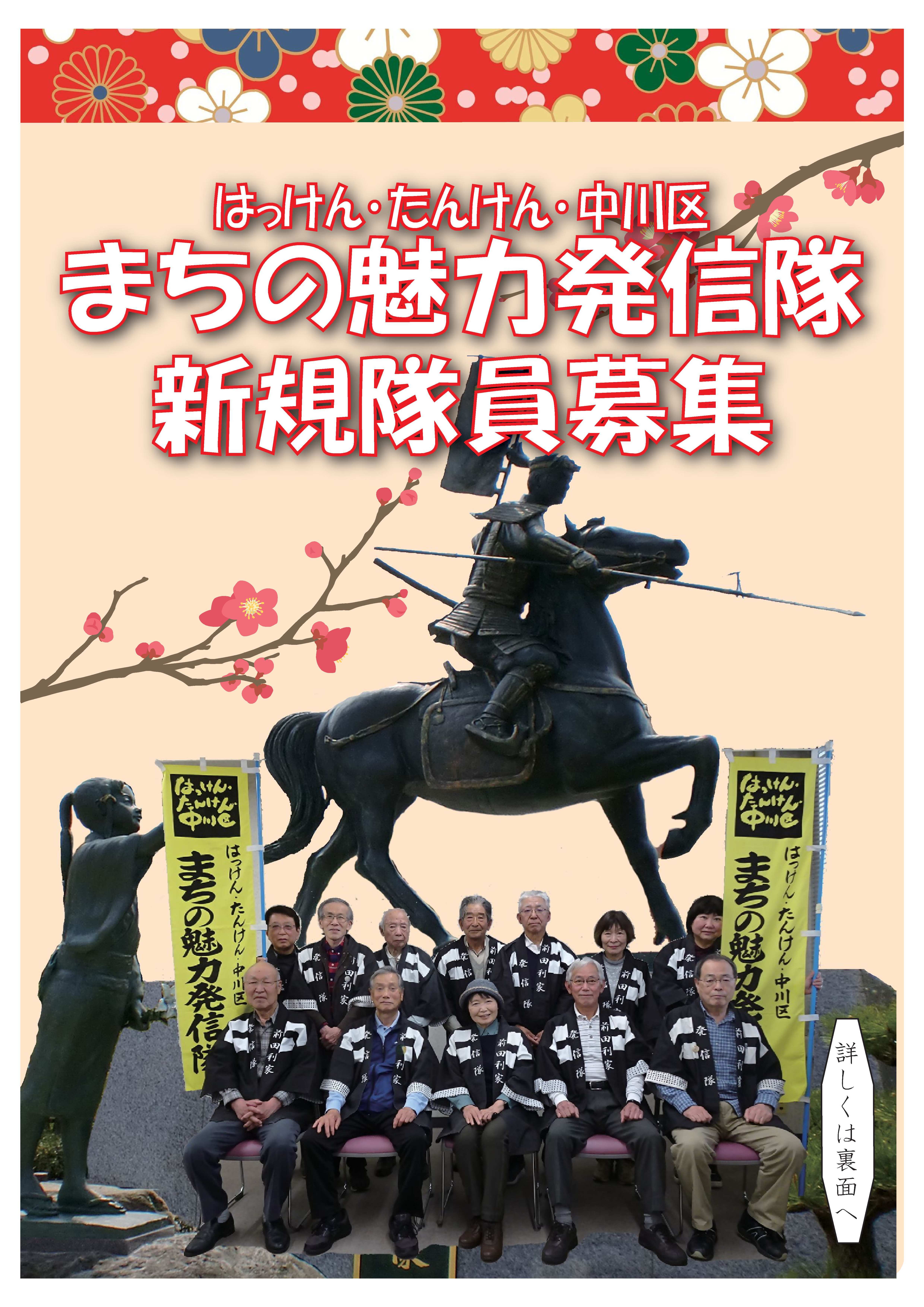 NHKの大河ドラマ「利家とまつ」の放映をきっかけに、郷土の英傑「前田利家」を広く発信しようと、平成13年2月に「前田利家発信隊」として結成されました。平成15年12月からは、中川区のさまざまな魅力を発見・発信しようと、「はっけん・たんけん・中川区まちの魅力発信隊」に改組し、新たな隊員も加わって活動を続けています。
