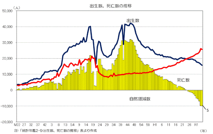 人口動態統計における明治22年以降の出生数、死亡数の推移を掲載しています。
