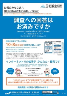 - 10月1日に調査期日を迎えました。回答がお済みでない世帯は10月8日(水)までに忘れずにご回答をお願いします。